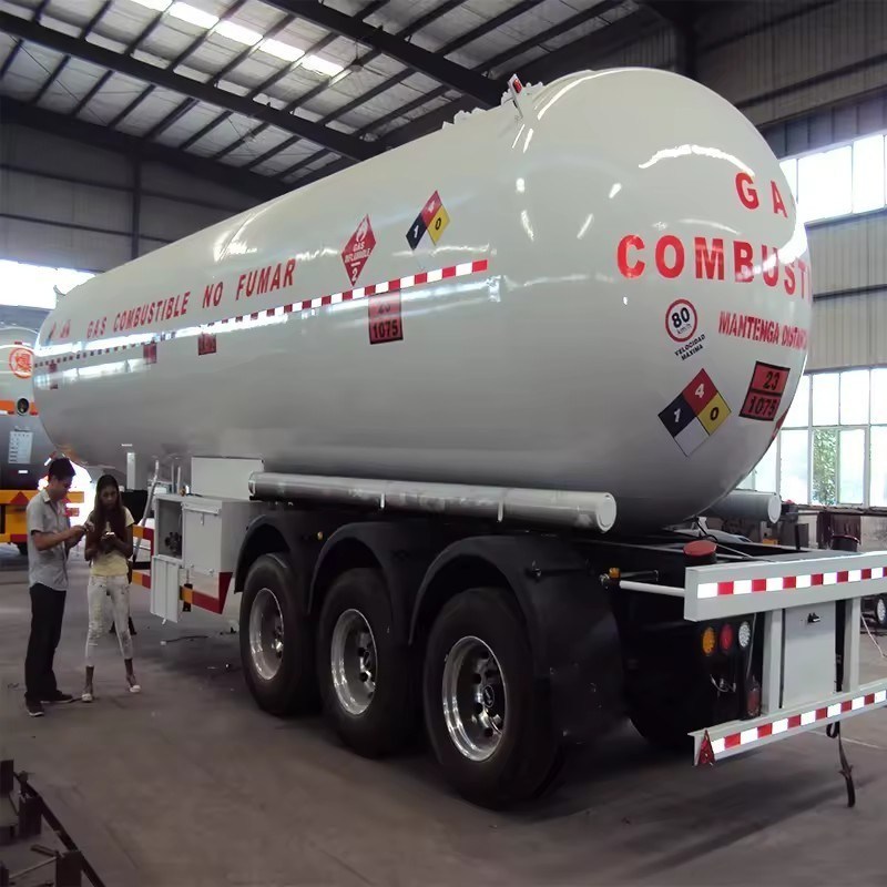 Een LPG-tankerhalve aanhangwagen is een speciale transporthalve aanhangwagen die wordt gebruikt voor het vervoer van propaan, propyleen, dimethylether, vloeibare ammoniak, methylamine, acetaldehyde en andere vloeibaar gemaakte gassen.De vloeibare-gasvervoers-half-aanhanger kan worden onderverdeeld in:: twee-assige half-aanhanger voor het vervoer van vloeibaar gas, drie-assige half-aanhanger voor het vervoer van vloeibaar gas.De vloeibare gastransporthalve aanhanger kan worden ontworpen en aangepast volgens de behoeften van de klant, geschikt voor vloeibare ammoniak, vloeibare zwaveldioxide, propyleen, propaan, vloeibaar petroleumgas, dimethylether, n-butane, isobutaan, butene, isobutaan, butadieen,cyclo Vervoershalve aanhangwagen voor de meeste gassen zoals oxyethane.