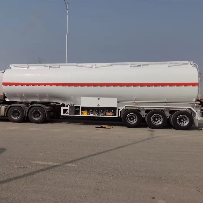 De tank van een brandstoftanker-aanhangwagen kan gemaakt worden van verschillende materialen, zoals aluminium, koolstofstaal en roestvrij staal.en het onderste uiteinde van de bufferplaat is ontworpen met door gaten om de impact van brandstof in de tank te verminderen en de sterkte van de tank te verbeteren.